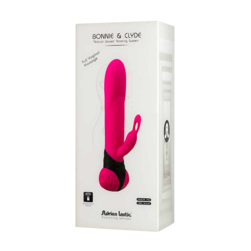 BONNIE & CLYDE UN Lapin rechargeable unique avec système innovant de vagues naturelles massant tout le canal vaginal de haut en bas! Plein de nouvelles sensations à jouer, à apprécier et à partager! Vibromasseur Rabbit Bonnie & Clyde avec système de vagues naturelles. Peut être utilisé avec ou sans télécommande (LRS). Chatouiller et taquiner avec ce luxueux lapin en silicone qui tourne, vibre et satisfait avec une gamme de fonctions titillantes. En plus d’avoir une tige ferme, un stimulateur clitoridien et des commandes simples, le Bonnie & Clyde est ultra silencieux. Avec sa surface en silicone rose fluo au toucher doux, ce superbe lapin a des fonctions puissantes. Il peut être facilement contrôlé soit par le bouton de la base, soit avec la télécommande LRS. C’est sans aucun doute le compagnon idéal des utilisateurs de lapins expérimentés qui seront surpris par son moteur presque silencieux.