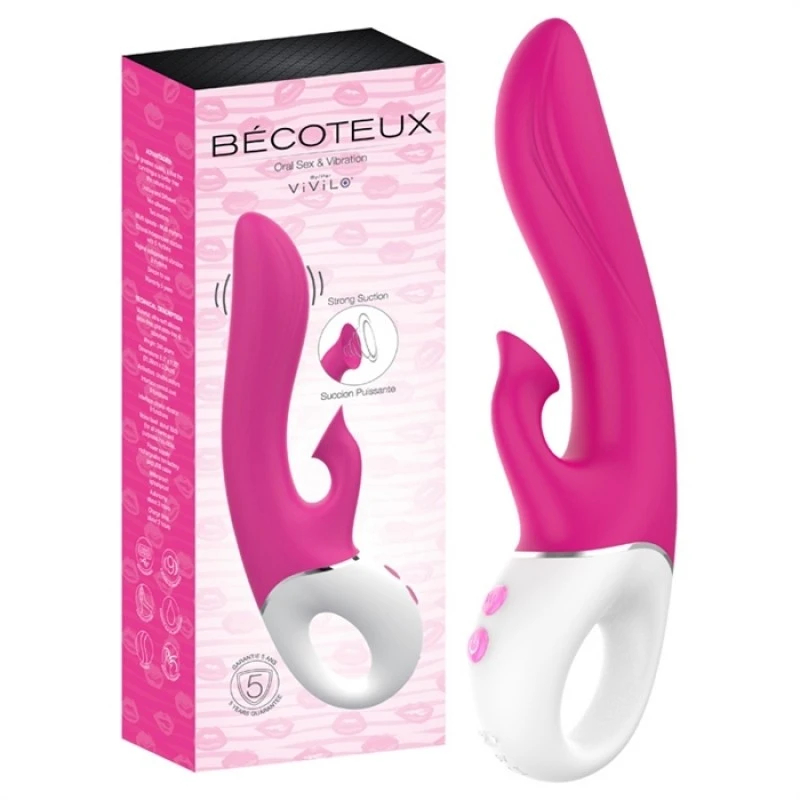 | Cette fois Vivilo se penche vers le sexe oral et la vibration avec le Bécoteux. Il est fait de pure silicone, très doux pour la peau, sans aucune possibilité d’allergies. Bécoteux est le plus silencieux de sa catégorie. Sa spécialité : le sexe oral dans sa partie clitoridienne avec 9 succions différentes; de léger à fort et par rythmes. Cette fois c’est vrai, c’est comme un petit robot suceur dépassant largement en sensations ce qu’un humain peut accomplir lors d’un cunnilingus. C’est une technologie de pointe alliant force de succion et forme touchant le clitoris de manière confortable. L’axe central vaginal lui a une courbe intéressante pour appuyer sur le point G et comporte 9 vibrations et rythmes différents. La succion et la vibration s’utilisent indépendamment ou les deux à la fois. Bécoteux un autre appareil Vivilo, qui vous offre un équilibre aussi parfait entre confort, efficacité et prix. Sans phtalate, sans odeur et il est rechargeable donc plus besoin de piles. Bécoteux vous offre la paix d’esprit avec sa garantie de 5 ans.