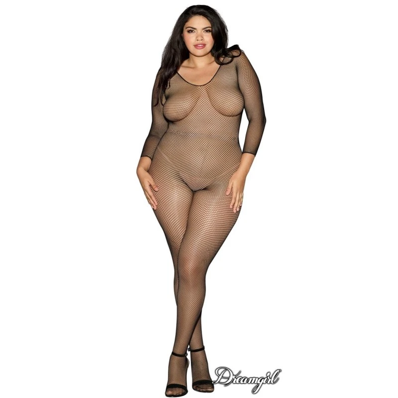 Bodystocking en filet avec des manches longues et à la fourche ouverte. G-string non-inclus. 100% Nylon O/S QUEEN NOIR