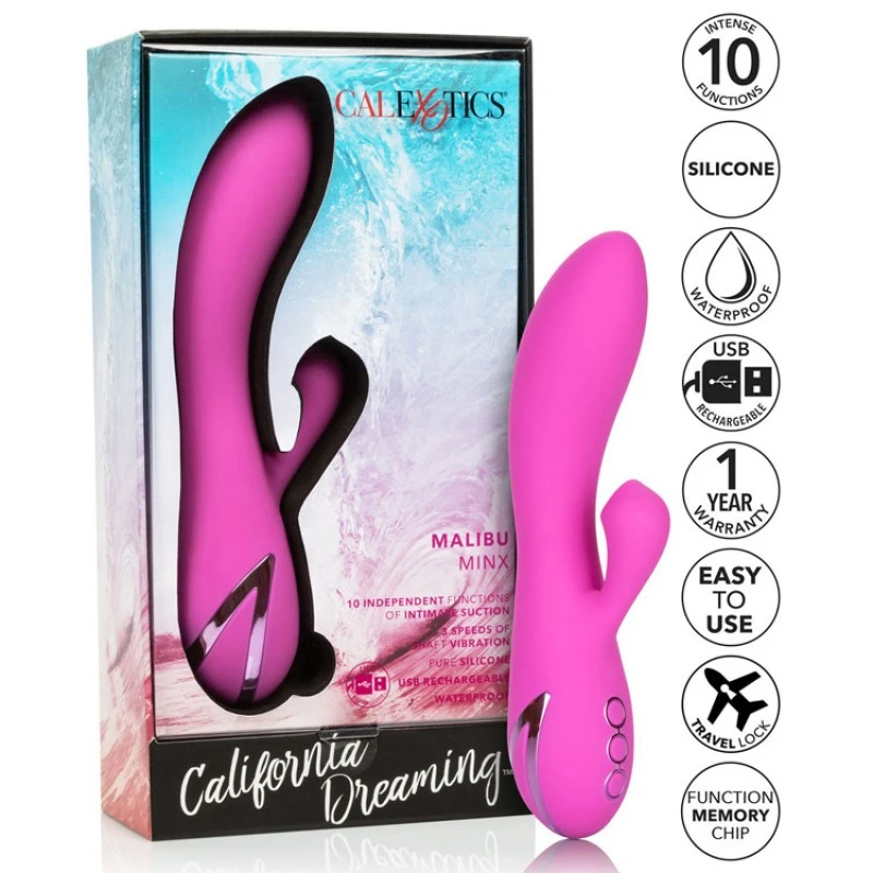 La collection California Dreaming ™ donne vie aux fantasmes avec le merveilleux Malibu Minx. Le masseur au design unique est prêt pour vos fantasmes préférés avec 10 fonctions puissantes d’aspiration clitoridienne et 3 vitesses de vibration qui font trembler les genoux.