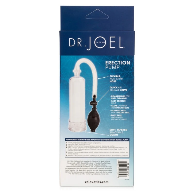 Améliorez votre outil avec la pompe à érection Dr. Joel KaplanŸ. Ce systÚme tout compris comprend une pompe à cylindre transparente avec une base à bride, un beignet amovible doux, une ampoule facile à presser et un tuyau flexible sans sertissage.