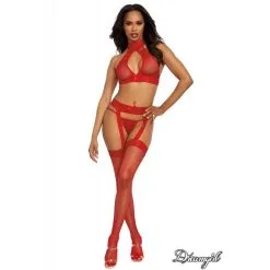 – Porte-jarretelles à taille haute avec une large taille en dentelle et des bas en filet rattachés par de larges jarretelles en dentelle fixes