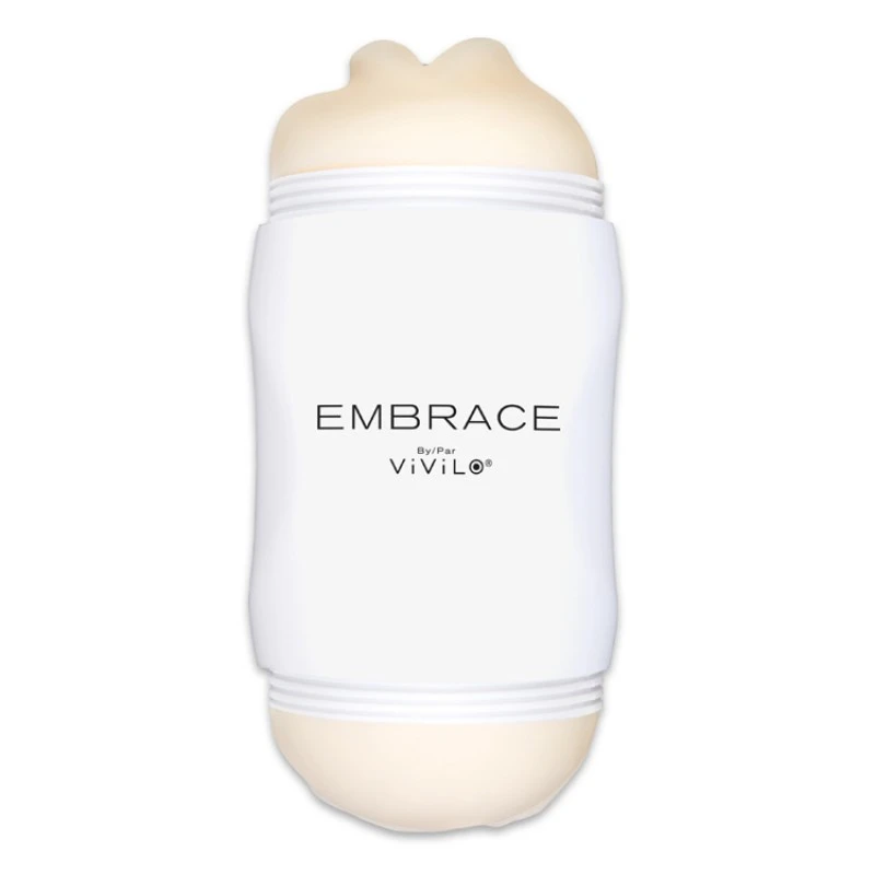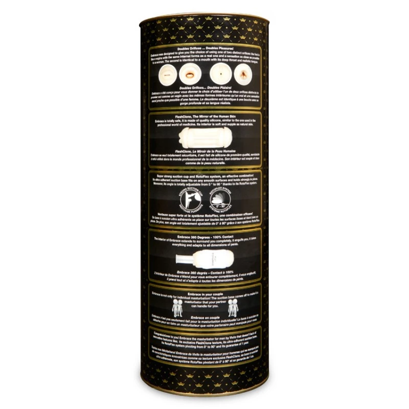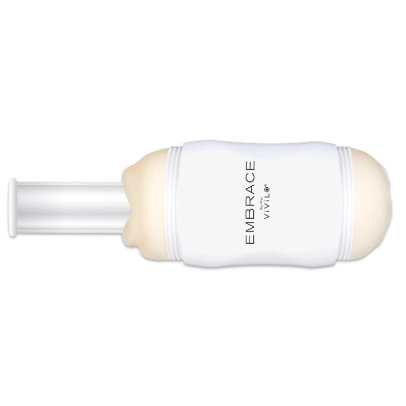 Embrace de Vivilo le masturbateur pour hommes qui ne manque pas de caractéristiques innovatrices comme sa texture exclusive FleshClone, sa base à succion ultra adhérente, son système RotoFlex pivotant de 0° à 90° et sa garantie de 1 an.
