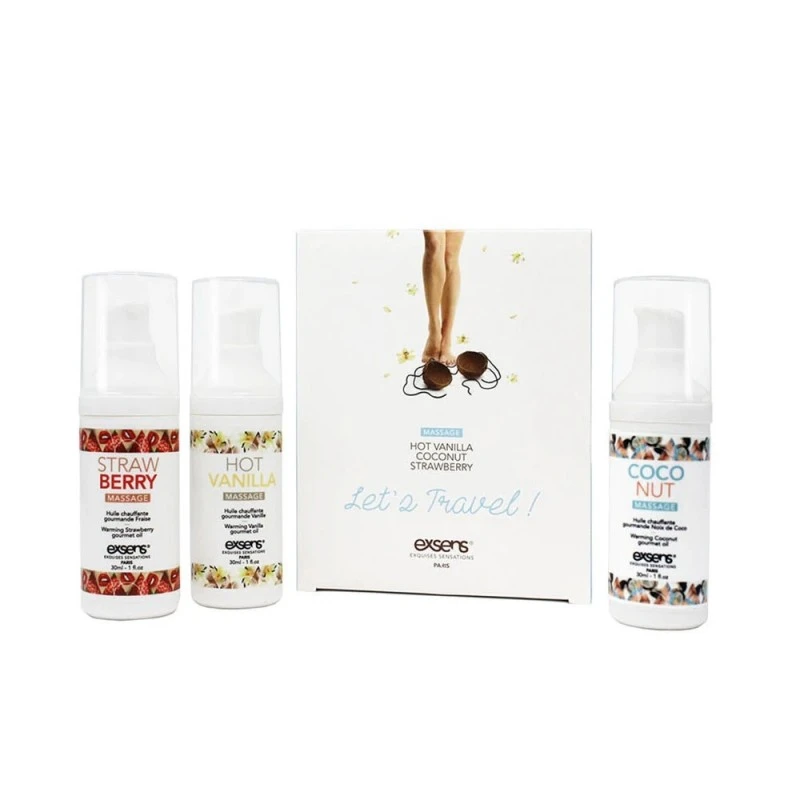 Faites- vous plaisir en déplacement avec nos Let’s Travel ! Kit de gel chauffant pour massage intime. Comprend trois exhausteurs de plaisir au format voyage (vanille piquante, fraise et noix de coco) créés pour les préliminaires intimes et le plaisir oral .
