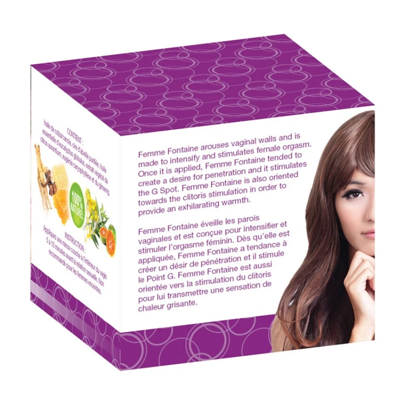 Femme Fontaine éveille les parois vaginales et est conçue pour intensifier et stimuler l’orgasme féminin. Dès qu’elle est appliquée, Femme Fontaine a tendance à créer un désir de pénétration et il stimule le Point G. Femme Fontaine est aussi orientée vers la stimulation du clitoris pour lui transmettre une sensation de chaleur grisante.