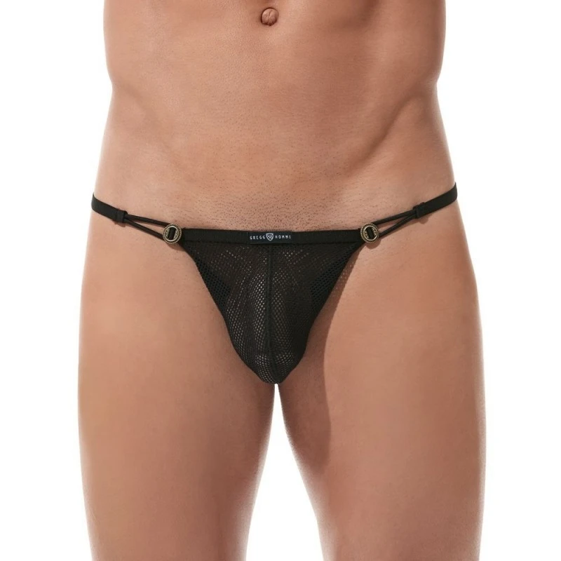 Ce peut être ton anniversaire tous les jours avec le string Conquistador. Deux petits boutons dorés maintiennent ensemble l’emballage à votre grande surprise.