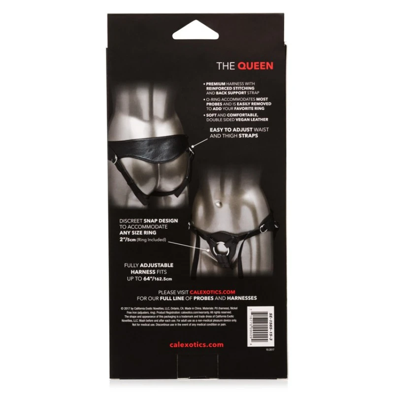 Préparez-vous à un plaisir palpitant et à une sonde de qualité supérieure parfaitement adapté à la royauté avec « The Queen ». Le harnais royal est fait pour la performance et le confort avec une sangle de soutien au bas du dos, une coupe ajustable et des coutures renforcées robustes. La conception élégante sans entrejambe séduit même les plus dominants avec les boutons-pression discrets conçus pour s’adapter à tout anneau de sonde de taille. Le cuir végétal double couche et les sangles réglables aux cuisses et à la taille vous donnent le contrôle ultime. Abandonnez-vous à vos fantasmes les plus charnels et plongez dans le plaisir érotique chaque fois que vous vous glissez dans ce harnais avant-gardiste. La taille entièrement ajustable convient à une taille allant jusqu’à 64 po (162,5 cm) et le joint interchangeable convient à la plupart des sondes d’un diamètre de 2 po (5 cm).