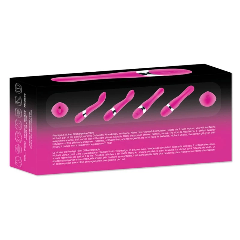 Nicha est la nouvelle gĂ©nĂ©ration du vibreur point G de la prestigieuse collection Vivilo. Design recherchĂ© et moulĂ© en silicone ultra-doux, Nicha vous dĂ©voile toutes ses qualitĂ©s Ă lâaide de 7 modes de stimulation trĂšs puissants et il est Ă©quipĂ© de deux moteurs silencieux; un au bout et un Ă la base, vous le ressentirez de partout Ă la fois. Il offre une large versatilitĂ© avec ses courbes raffinĂ©es positionnĂ©es juste au bon endroit et il est 100% Ă©tanche et submersible. Nicha vous accompagne partout : sous la douche, le bain, le sauna, il nây a donc pas de limites aux endroits oĂč il sâutilise. Le vibreur point G Nicha de Vivilo, est le seul Ă offrir un Ă©quilibre aussi parfait entre confort, efficacitĂ© et prix et ainsi vous faire dĂ©couvrir une expĂ©rience aussi impressionnante quâabordable. Il ne contient aucun phtalate, il est sans odeur et il est rechargeable donc plus besoin de piles. Nicha est un vibreur dâexception qui se donne avec joie en cadeau et il vous arrive avec un coffret de rangement et une garantie dâ1 an.