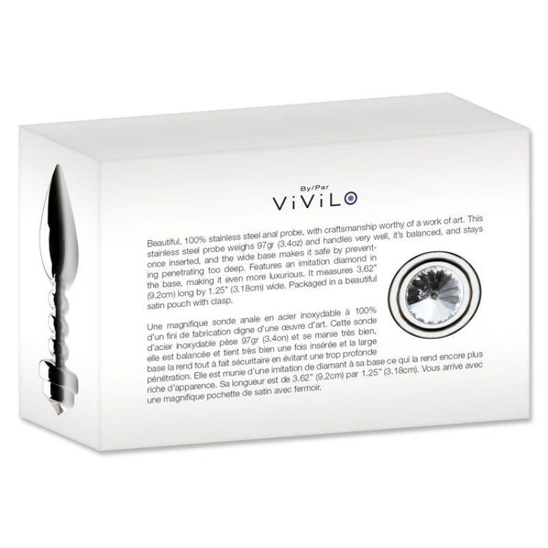 Une magnifique sonde anale en acier inoxydable à 100% d’un fini de fabrication digne d’une oeuvre d’art. Cette sonde d’acier inoxydable se manie très bien, elle est balancée et tient très bien une fois insérée et la large base la rend tout à fait sécuritaire en évitant une trop profonde pénétration. Elle est munie d’une imitation de diamant à sa base ce qui la rend encore plus riche d’apparence. Sa longueur est de 3.62’’ (9.2cm) par 1.25’’ (3.18cm).