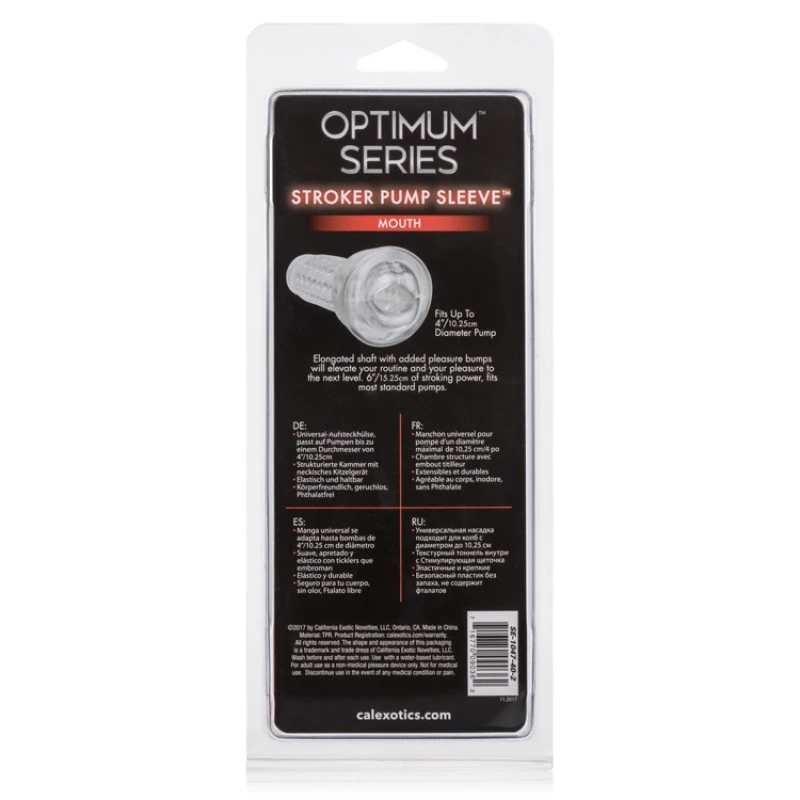 Prêt pour une séance de pompage ultra-confortable ou préférez-vous vous livrer à un jeu solo sensationnel? Quelles que soient vos envies, les manchons Stroker Pump Sleeve ™ de la série Optimum ™ sont prêts à vous faire passer au niveau supérieur. Cette entrée ultra-extensible en forme de bouche possède un corps allongé et des rangées de perles stimulantes pour une expérience de masturbation intense avec des résultats vraiment explosifs. Le manchon de qualité convient à la plupart des pompes standard mais peut être utilisé indépendamment pour une expérience passionnée de caresses. Le jouet de masturbation TPR de qualité supérieure est un produit sans danger, sans parfum et sans phtalate, pour vous heureux et en bonne santé. Profitez d’un nettoyage facile avec ce stroker sans entretien. Il suffit de la laver à l’eau chaude et au savon avant et après chaque utilisation. Utilisez suffisamment de lubrifiant pour une insertion facile.
