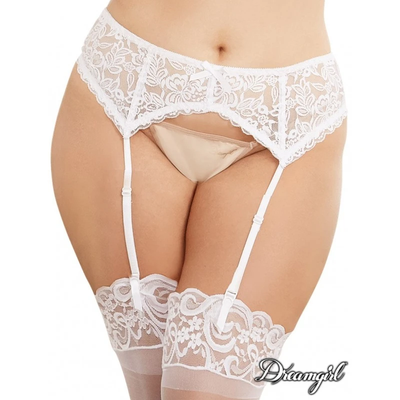 Porte-jarretelle en dentelle extensible avec des jarretelles ajustables et un fermoir à crochet ajustable au dos.