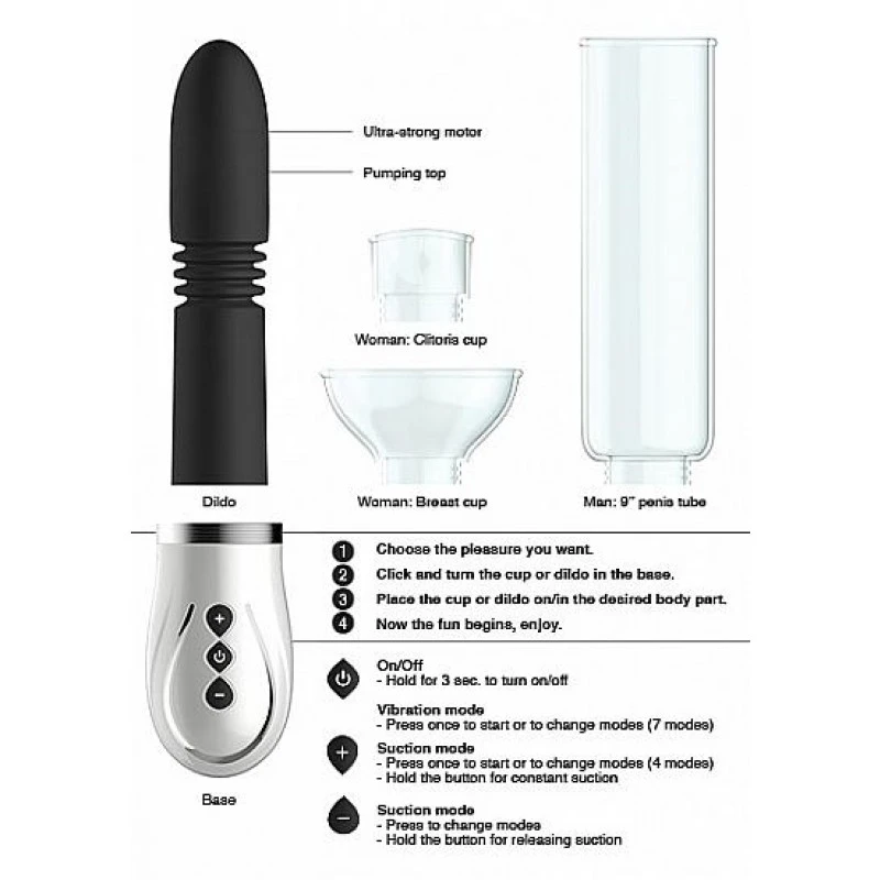 Taille: Base: 9,3cm x 5,4cm x5,3cm – Tube pénien: 20,4cm x 6,2cm x 6,2cm – Diamètre intérieur: 5,5cm – Longueur insérable: 15,5cm – Pompe à mamelon: 5,7cm x 9,9cm x 9,9cm – Diamètre intérieur: 9,1cm – Pompe clitoridienne: 4,5cm x 6,7cm x 4,9cm – Dimensions intérieures: 2,7cm x 5,9cm x 4,2cm – Gode: 16,3cm x 3,3cm x 3,3 cm – Diamètre: 3,3cm – Longueur insérable: 15cm