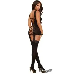 Robe en dentelle extensible semi-transparente avec des bretelles extensibles bordées de dentelle, un dos lacé avec un ruban de satin ajustable et jarretelles rattachés à des bas bordés de dentelle. G-string non-inclus.