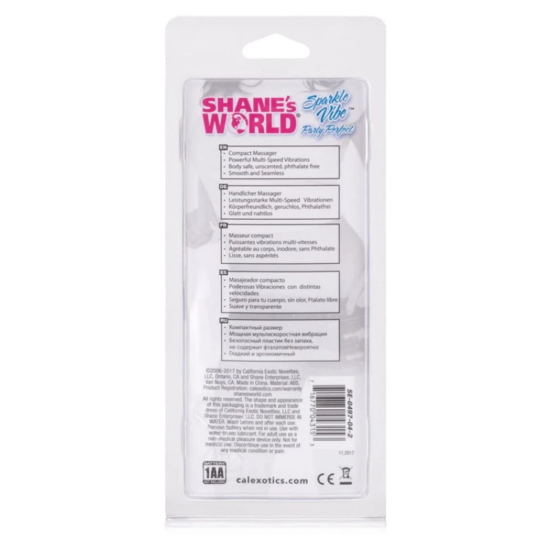 Pourquoi ne pas ajouter un peu d’éclat à vos orgasmes? Le Shane’s World Sparkle Vibe est un vibromasseur puissant, compact et parfait pour les fêtes avec une action à plusieurs vitesses qui procure un plaisir intense. Ce petit jouet sexuel étincelant et féminin est merveilleusement lisse et sans couture pour un plaisir total sur les lèvres, le clitoris ou le point G. C’est un jouet soyeux, parfait pour une soirée solo ou une nuit d’aventure (et de nombreux orgasmes puissants) avec un partenaire. Il mesure 4,5 pouces de long et 1 pouce de large, de sorte qu’il peut vous combler et frapper ces points profonds et sensibles,il peut recouvrir chaque pouce de vos lèvres pour des vagues de plaisir excitant. Ce vibromasseur est fini avec des paillettes chatoyantes et conçu pour tout type de plaisir. Augmentez les vibrations puissante mais totalement discrète, pour que la fête commence vraiment. Votre plaisir est totalement entre vos mains avec ce masseur personnel – continuez simplement à appuyer sur la puissance de la base de la vibration jusqu’à ce que vous trouviez la vitesse qui vous envoie au 7e ciel. Son utilisation est simple: il suffit d’ouvrir le compartiment à piles situé à la base, d’insérer une seule pile AA et de fermer le compartiment en toute sécurité avant de se lancer dans des orgasmes vraiment impressionnants. Préparez-vous à faire la fête avec le Shane’s World Sparkle Vibe.