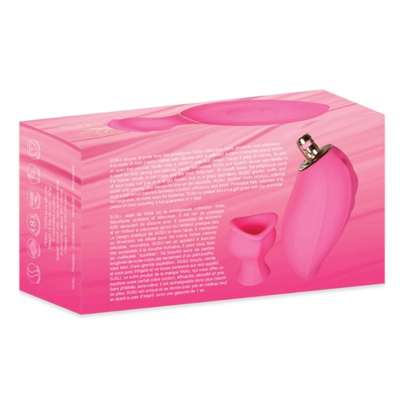 SUSU, objet de fierté de la prestigieuse collection Vivilo. Sécuritaire, puissant et silencieux, il est fait de plastique ABS recouvert de silicone avec 8 intensités de succions et un moteur si silencieux qu’on ne l’entend presque pas. Le Design pratique de SUSU le rend facile à manipuler, sa dimension est idéale pour les mains fortes comme délicates. Innovateur, SUSU est un appareil à succion très semblable à la bouche humaine, il peut vous faire les meilleures ‘’sucettes’’. Sa bouche suce les parties érogènes de votre corps pas seulement d’un petit souffle, mais bien d’une grande aspiration, SUSU broute, renifle et suce avec fringale et ne laisse personne sur son appétit. SUSU, un autre produit de la marque Vivilo, qui vous offre un équilibre aussi parfait entre confort, efficacité, sécurité et prix. Sans phtalate, sans odeur, il est rechargeable donc plus besoin de piles. SUSU est unique et se donne avec joie en cadeau tout en ayant la paix d’esprit avec une garantie de 1 an.