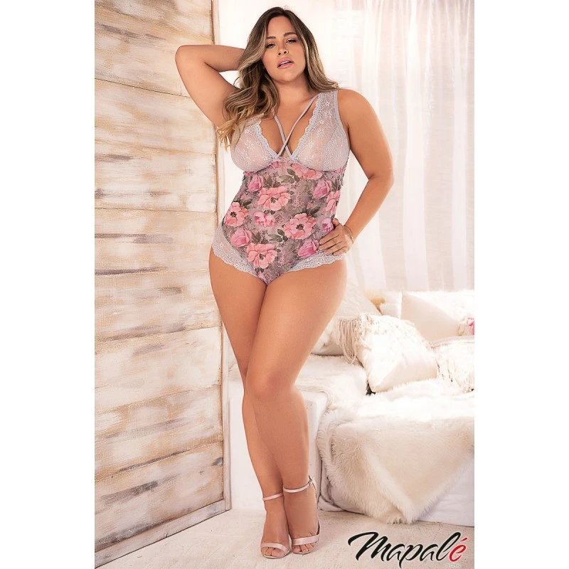 Teddy en mesh douce très extensible avec un imprimé fleuri, des bonnets en dentelle cerclés entourés d’élastiques , un dos lacé ajustable, une bordure en dentelle contrastante formant un dos coupe thong et une fermeture à crochet ajustable à la fourche.