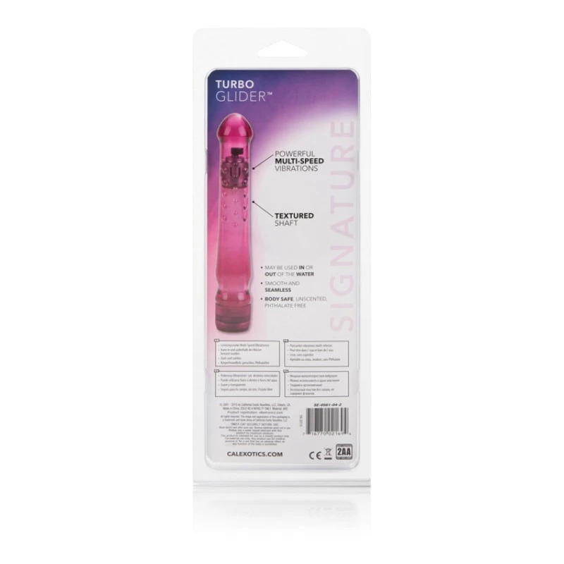 Ce Turbo Glider est votre nouvelle baguette magique. Avec son look discret et la fonctionnalité multi-vitesse, vous voudrez l’avoir avec vous, en tout temps. La partie supérieure de l’appareil de massage a 6 rangées verticales de bosses qui permettront d’améliorer la stimulation. Sa tête lisse a une pointe de plaisir qui est sûre de stimuler et masser n’importe quelle partie de votre corps. Profitez de la sensation et surprenez votre partenaire dans ou hors de l’eau.