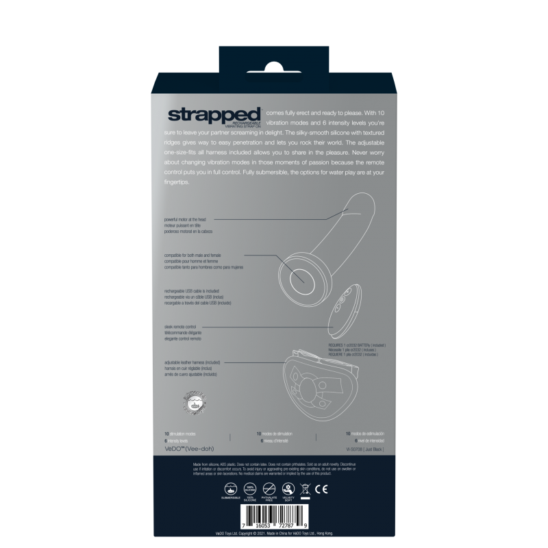 STRAPPED est entièrement dressé et prêt à plaire. Avec ses10 modes de vibration et 6 niveaux d’intensité, vous êtes sûr de laisser votre partenaire hurler de plaisir. Le silicone lisse et soyeux avec des crêtes texturées cède la place à une pénétration facile et vous permet de faire basculer leur monde. Le harnais taille unique ajustable inclus vous permet de partager le plaisir. Ne vous inquiétez jamais de changer de mode de vibration dans ces moments de passion, car la télécommande vous donne un contrôle total. Entièrement submersible, les options de jeux aquatiques sont à portée de main.