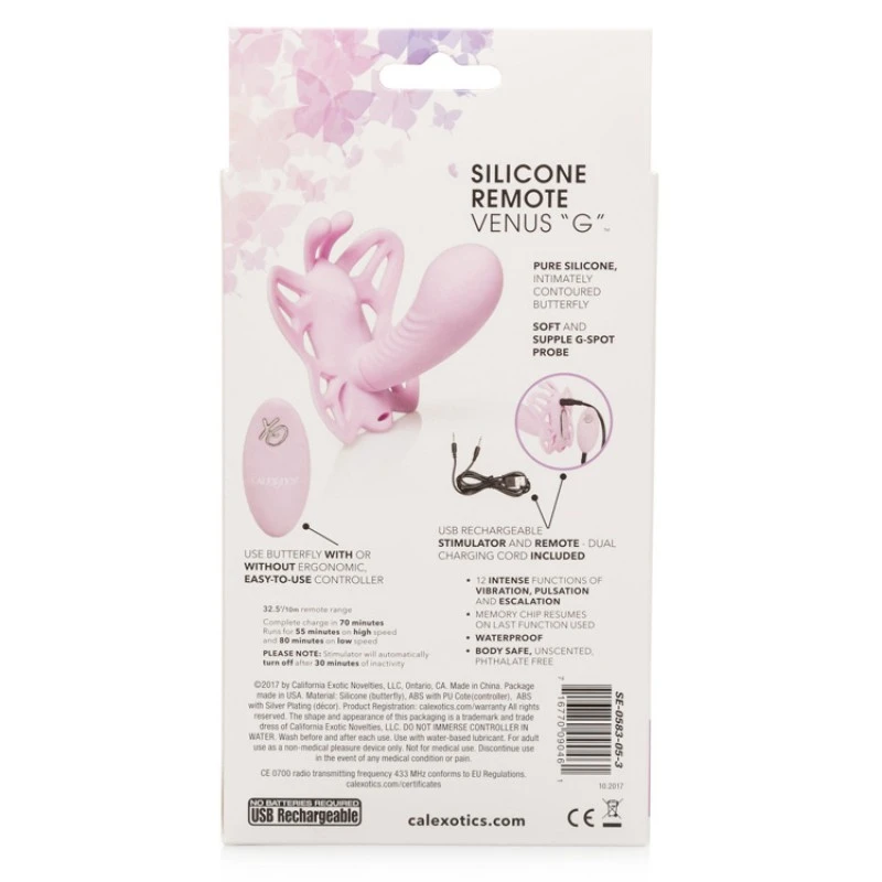 Préparez-vous à être plongé dans un monde de stimulation avec le Venus Butterfly Silicone Remote Venus “G” ™. La collection Venus Butterfly, de renommée mondiale, a réussi à constituer une forme aux contours intimes, un masseur de points G pliable et 12 fonctions de vibration intenses. Déployez vos ailes et allumez-vous à tout moment avec la télécommandes allant jusqu’à 10 mètres! Alors que le vibrateur aux courbes sensuelles offre une stimulation du point G qui agite les genoux, le papillon stimule l’extérieurs. Pour l’utiliser avec la télécommande, maintenez le bouton de commande enfoncé pendant 3 secondes pour allumer / éteindre et utilisez le bouton XO pour faire défiler les 12 fonctions de vibration, de pulsation et d’intensité. Bien que l’ambiance facile à utiliser puisse être utilisée avec ou sans télécommande pour contrôler l’intensité, la puce mémoire ultramoderne intégrée rappelle à quel point vous l’aimez en démarrant avec la dernière fonction utilisée. Rechargez le masseur en silicone premium en 70 minutes avec le câble USB à double charge fourni pour profiter de 55 minutes de stimulation à grande vitesse ou de 80 minutes de vibrations à basse vitesse. Le silicone hypoallergénique de qualité supérieure est sans danger pour le corps, sans parfum et sans phtalate pour vous garder heureux et en bonne santé.