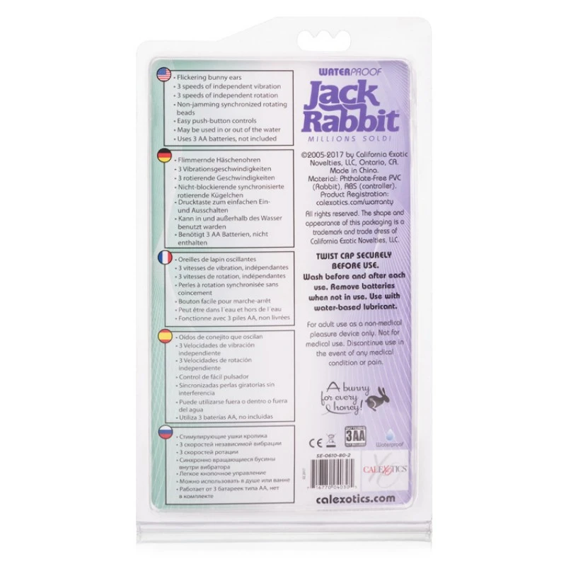 Notre n ° 1 Jack Rabbit. Le Waterproof Jack Rabbit est le compagnon idéal pour un plaisir intime extrêmement agréable. La vibration de rotation réversible à plusieurs vitesses est idéale pour les explorateurs expérimentés et les débutants audacieux à la recherche d’une expérience orgasmique mémorable. Fabriqué à partir de PVC lisse et souple sans phtalates, le masseur discret mesure 12 cm x 3,75 cm. Le vibrateur a une tige en gelée transparente, avec 5 rangées de billes en métal, et un teaser clitoridien en forme de lapin, avec des oreilles qui vibrent pour une stimulation intense. Pour maximiser le plaisir, le masseur dispose de 3 vitesses de vibration et de 3 vitesses de rotation réversible. Pour intensifier les sensations, il est recommandé d’utiliser un lubrifiant de qualité. Le Jack Rabbit imperméable rend le temps passé seul dans le bain ou la douche beaucoup plus amusant!. Le stimulateur fonctionne avec 3 piles AA et dispose d’un boîtier pour piles EZ Load. N’oubliez jamais de nettoyer le vibrateur avant et après utilisation. Vaporiser avec un nettoyant pour jouet ou laver à l’eau chaude savonneuse.