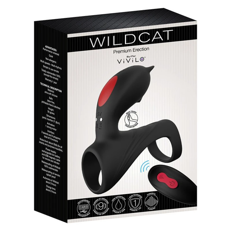 Vivilo ose vous présenter le Wildcat pour Hommes. Sécuritaire, agressif et silencieux, Wildcat est un objet destiné à la performance et fait de pure silicone, très doux pour la peau, sans aucunes possibilités d’allergies. La solution pour une érection soutenue et forte en étant tout à fait confortable, c’est ça Wildcat et il s’ajuste à toutes les dimensions de pénis, il est à la fois ferme et flexible, il s’étire facilement. Il suffit de l’enfiler sur le pénis et il maintient l’érection, stimule autant la femme que l’homme avec ses 3 vitesses différentes et ses 6 rythmes endiablés. Le pénis devient le vibrateur vivant tout en stimulant le clitoris. Il est contrôlé à l’aide d’une manette externe, ce qui vous laisse une parfaite liberté de mouvement. Il s’utilise seul pour monsieur seulement ou à deux et dans les deux cas, il est très énergique. Totalement submersible étanche à 100% à l’eau, il s’utilise vraiment partout. La manette et le vibrateur Wildcat sont tous deux rechargeables, aucunes piles n’est nécessaire. Le Wildcat un autre appareil Vivilo sans phtalate et sans odeur, qui vous offre un équilibre aussi parfait entre confort, efficacité, prix.