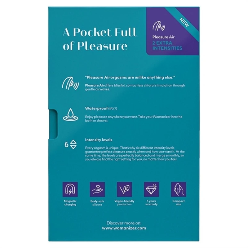 Technologie Pleasure Air Conçu pour vous et votre corps : Tous les produits WOMANIZER sont dotés d’une innovation unique appelée Pleasure Air Technology. Pourquoi est-elle si spéciale ? Votre clitoris est stimulé sans contact direct. De douces vibrations d’air aspirent et massent ensemble pour procurer une sensation orgasmique sans précédent. |