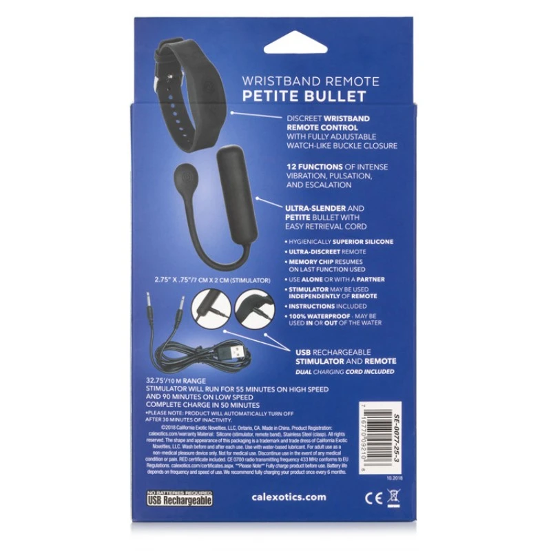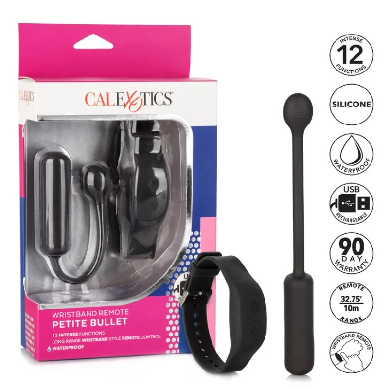 Le « Wristband Remote Petite Bullet » est un mini-vibrateur puissant associé à un bracelet-contrôleur discret et ludique pour les amateurs de plaisir plus aventureux. Le bracelet élégant, mais discret, facilite le contrôle de l’intensité des vibrations pour vous ou votre amoureux. Où que vous soyez, quelle que soit votre passion, la portée de 32.5 pi et les 12 fonctions de vibrations intenses de ce bullet sont prêtes pour la récréation.